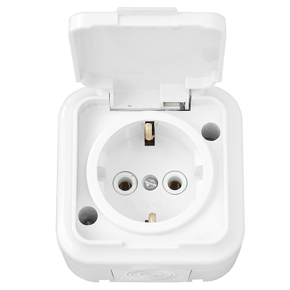 Розетка 1-местн.IP54 с земл., откр. уст., 220.250 В, 50Гц, 16А, УХЛ4, габ.разм.: 71х71х54 мм; уст.разм.: 53±0,2, сеч.пров. 1,5-2,5 мм2 Код: РА16-214