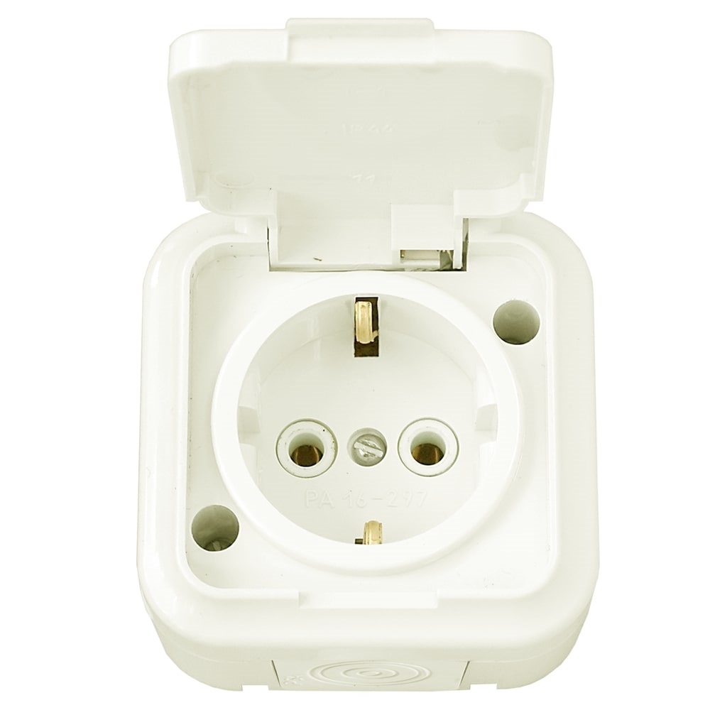 Розетка 1-местн.IP54 с земл., откр. уст., 220.250 В, 50Гц, 16А, УХЛ4, габ.разм.: 70х70х51 мм; уст.разм.: 53±0,2, сеч.пров. 1,5-2,5 мм2 Код: 05449