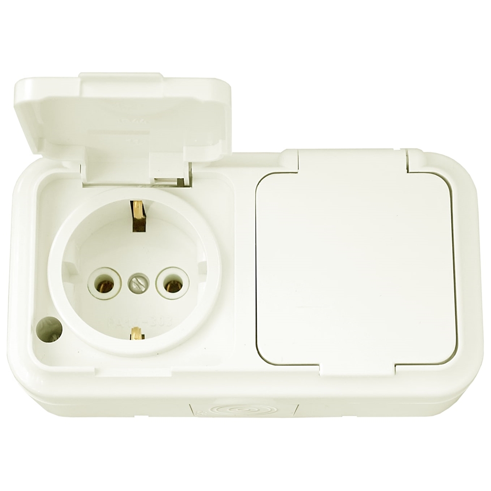 Розетка 2-местн.IP54 с земл., откр. уст., 220.250 В, 50Гц, 16А, УХЛ4, габ.разм.: 130х70х51 мм; уст.разм.: 113х53±0,2, сеч.пров. 1,5-2,5 мм2 Код: 05452
