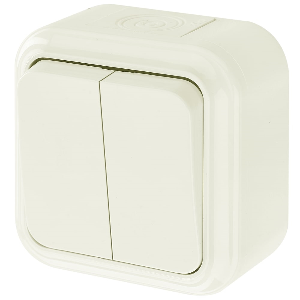 Выключатель 2-клав. IP54, откр.уст., 6А, 220.250 В, 50Гц, УХЛ4, габ.разм.: 70х70х41 мм; уст.разм.: 53±0,2, сеч.пров. 1-2,5 мм2 Код: 05444